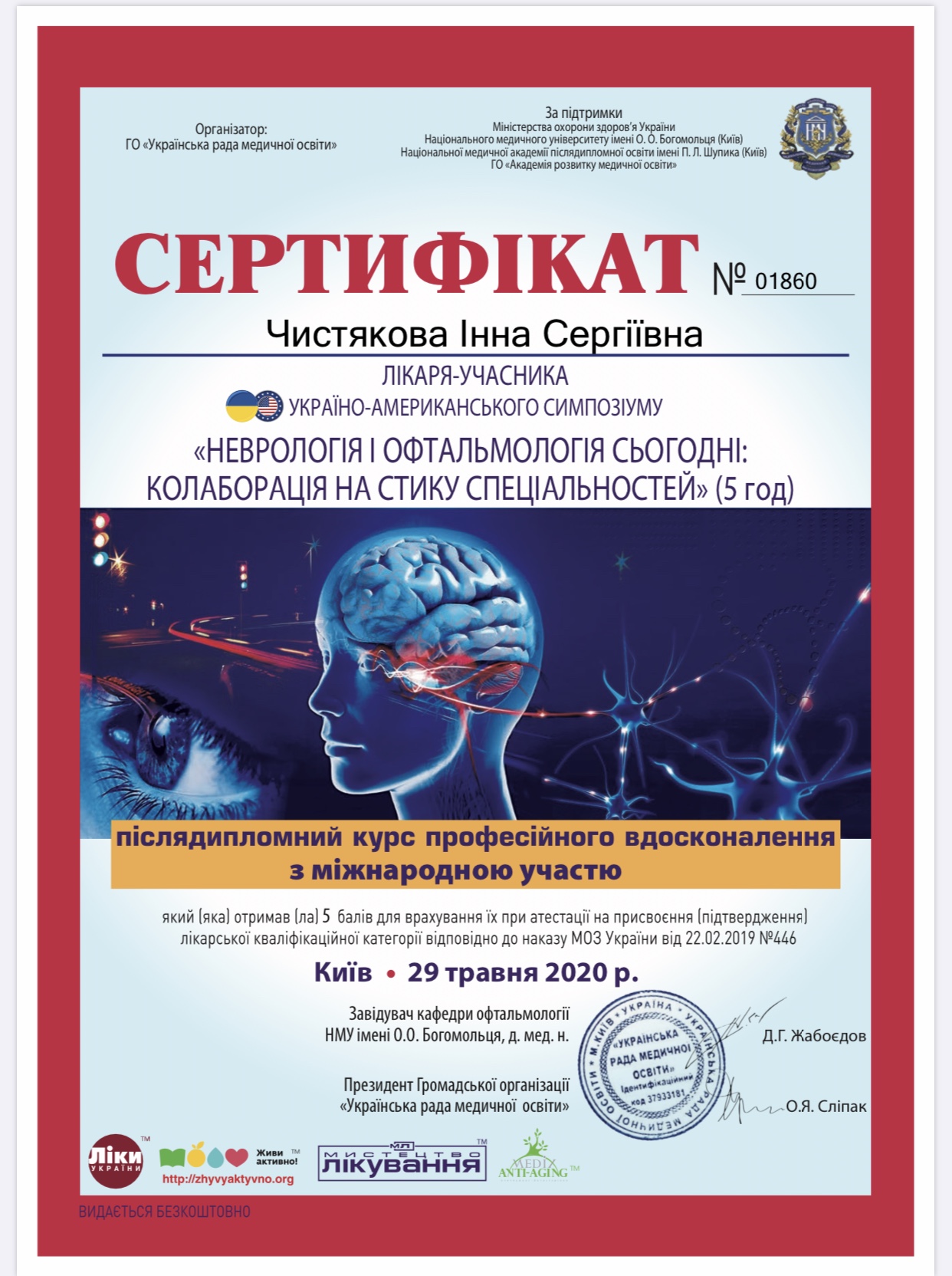 Закінчила Запорізький державний медичний університет в 2015 р. Проходила інтернатуру з 2015 по 2017 рік на базі Обласного центра мікрохірургії ока та лазерних технологій КЗ ХОКЛ м.Херсон та Обласного центру мікрохірургії ока КЗ ЗОКЛ м.Запоріжжя. З 2017 по 2019 рік працювала лікарем-офтальмологом в «Центрі відновлення зору», а з 2021 року по лютий 2022 року - у «Відділенні мікрохірургії ока» та у МЦ “Treviso” м.Херсон. З 2022 по 2023 рік - лікар-офтальмолог в МЦ «Діасервіс». В 2022 році закінчила курси підвищення кваліфікації за темою «Лазерні методи лікування захворювань сітківки. Лазерні методи лікування глаукоми» на базі кафедри офтальмології ЗМАПО м.Запоріжжя. В 2023 році закінчила курси підвищення кваліфікації за темою «Інтравітреальна терапія» на базі кафедри офтальмології ЗДМФУ м.Запоріжжя. В 2023 році пройшла семінар «Основи гоніоскопії».